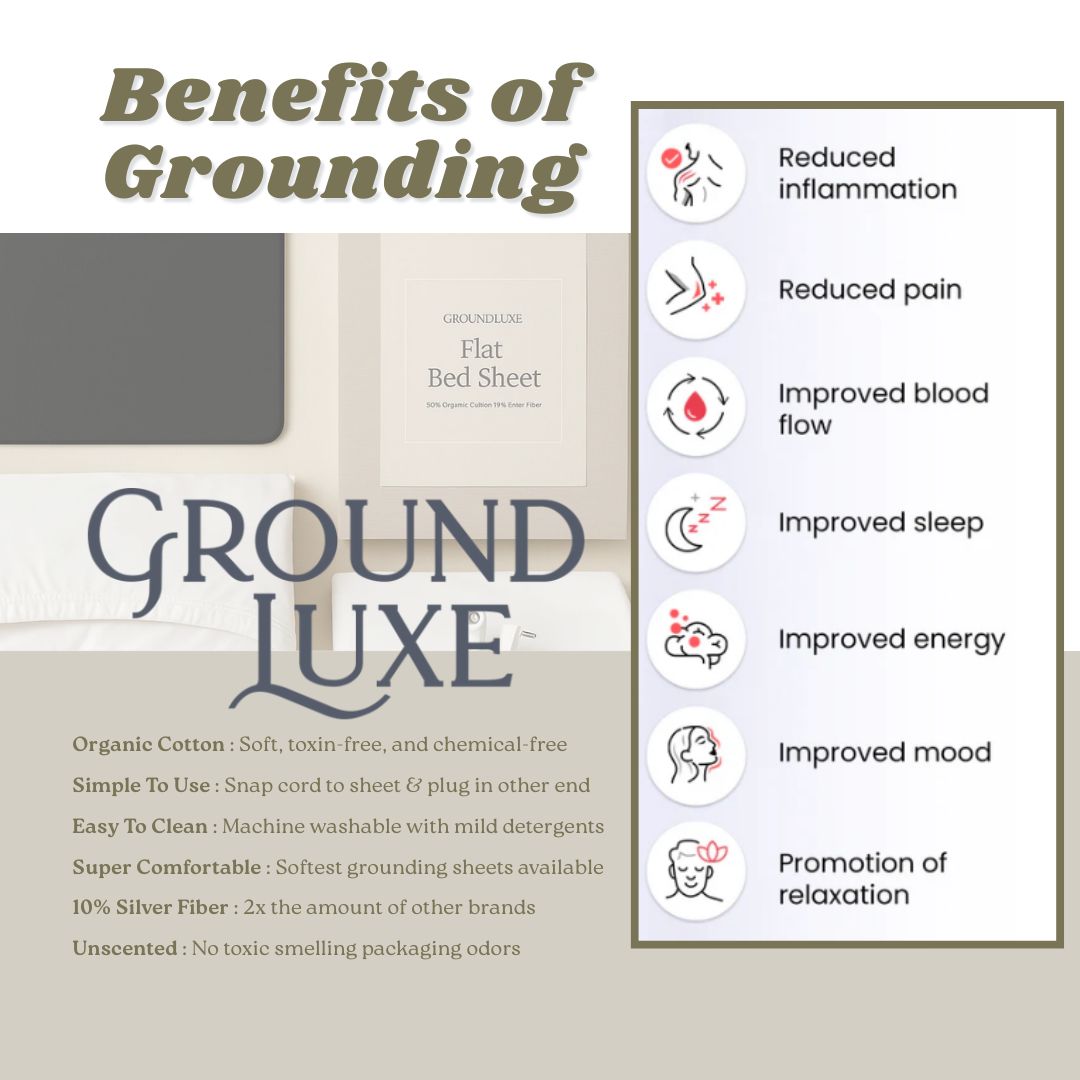 Bring the Benefits of Grounding Indoors with Ground Luxe. A small, US-based company that had been making luxuriously soft grounding bed sheets since 2021. They have raised the bar for grounding sheets & mats with superior design, premium quality, and real customer support in the U.S. from people who care. Organic Cotton, Simple to Use, Easy to Clean, Super Comfortable, 10% Silver Fiber, Unscented.